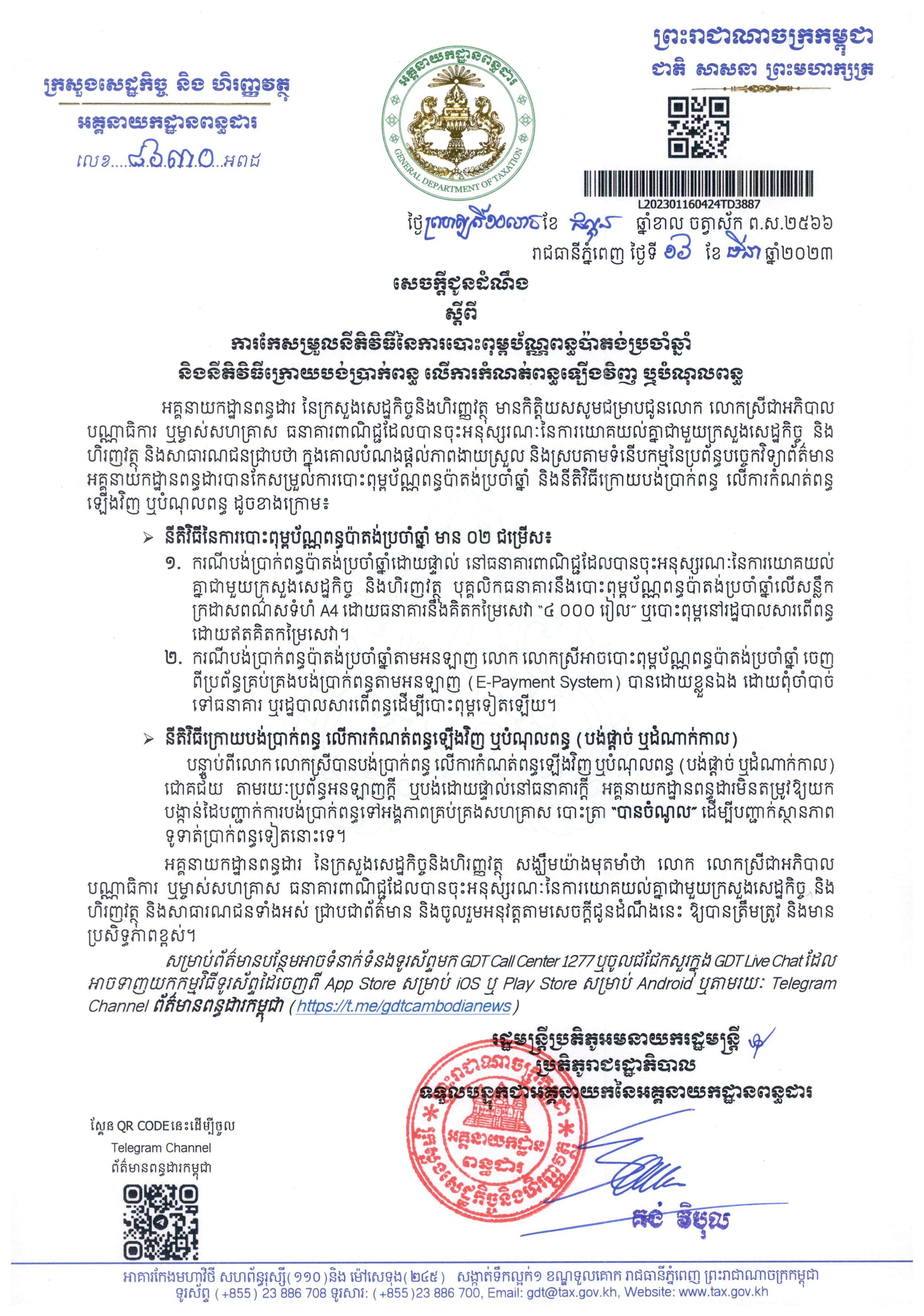 សេចក្តីណែនាំ ស្តីពី ការអនុវត្តកាតព្វកិច្ចការពើពន្ធចំពោះការជួលអចលនទ្រព្យ