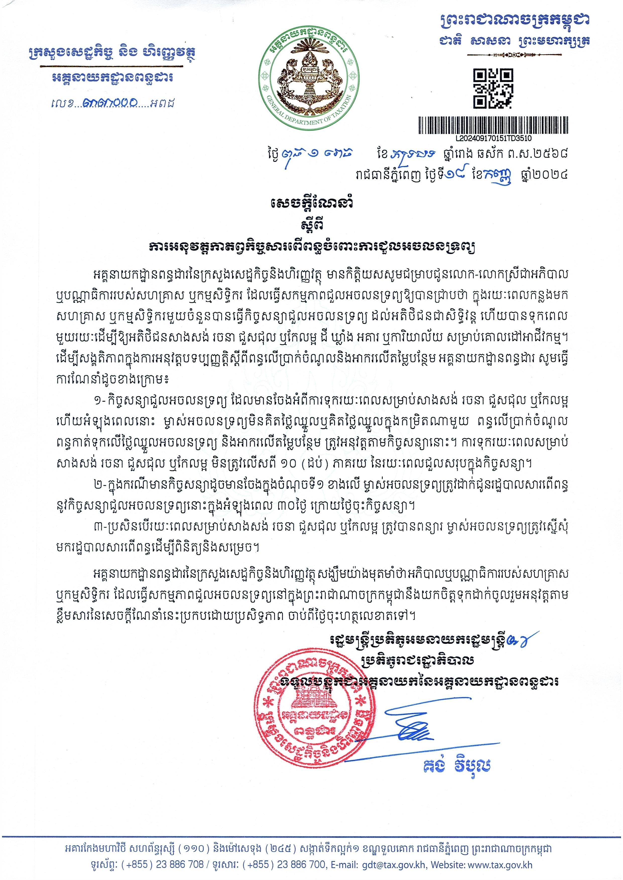 សេចក្តីជូនដំណឹង ស្តីពី ការកែសម្រួលនីតិវិធីនៃការបោះពុម្ពប័ណ្ណពន្ធប៉ាតង់ប្រចាំឆ្នាំ និងនីតិវិធីក្រោយបង់ប្រាក់ពន្ធ លើការកំណត់ពន្ធឡើងវិញ ឬបំណុលពន្ធ