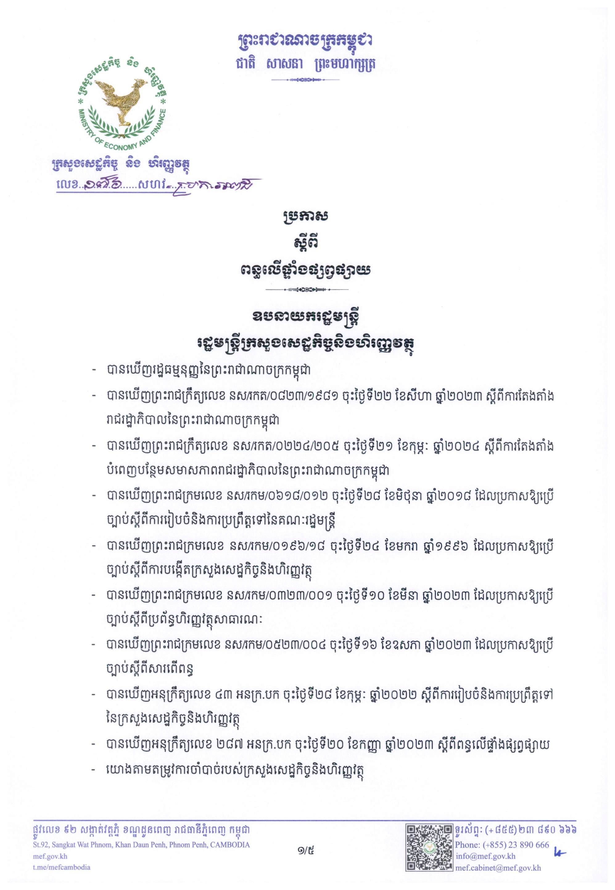 ប្រកាស ស្តីពី ការអនុវត្តអនុក្រឹត្យលេខ ៤០ អនក្រ.បក ចុះថ្ងៃទី៣១ ខែមីនា ឆ្នាំ២០១៥ ស្តីពីការកែសម្រួលតារាងពន្ធតែមប្រិ៍សារពើពន្ធ