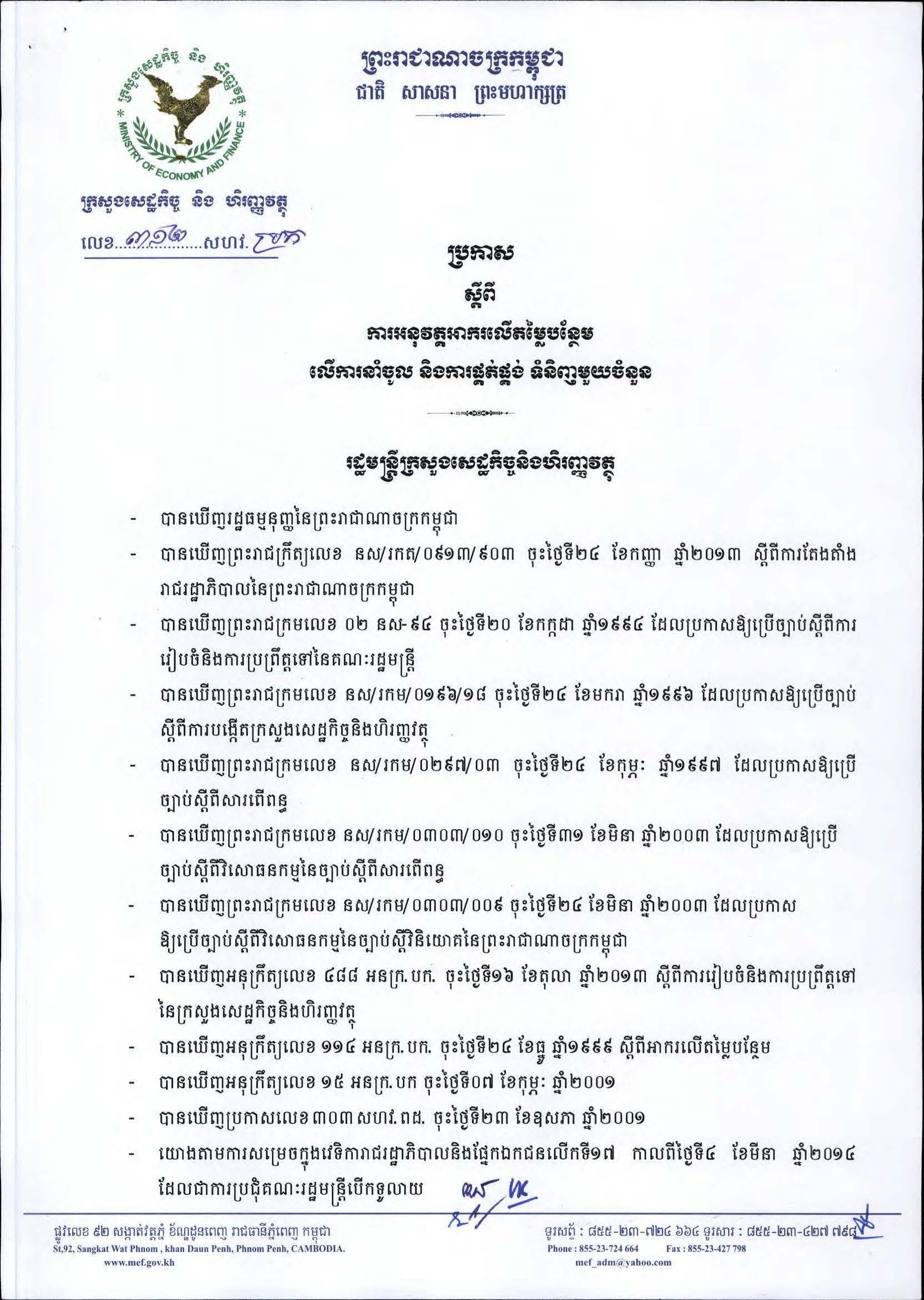 See Moreប្រកាស ស្តីពី ការចាត់ជាបន្ទុករបស់រដ្ឋនូវអាករលើតម្លៃបន្ថែមលើមុខទំនិញដែលជាអាហារជាមូលដ្ឋានសម្រាប់ការរស់នៅប្រចាំថ្ងៃរបស់ប្រជាពលរដ្ឋ