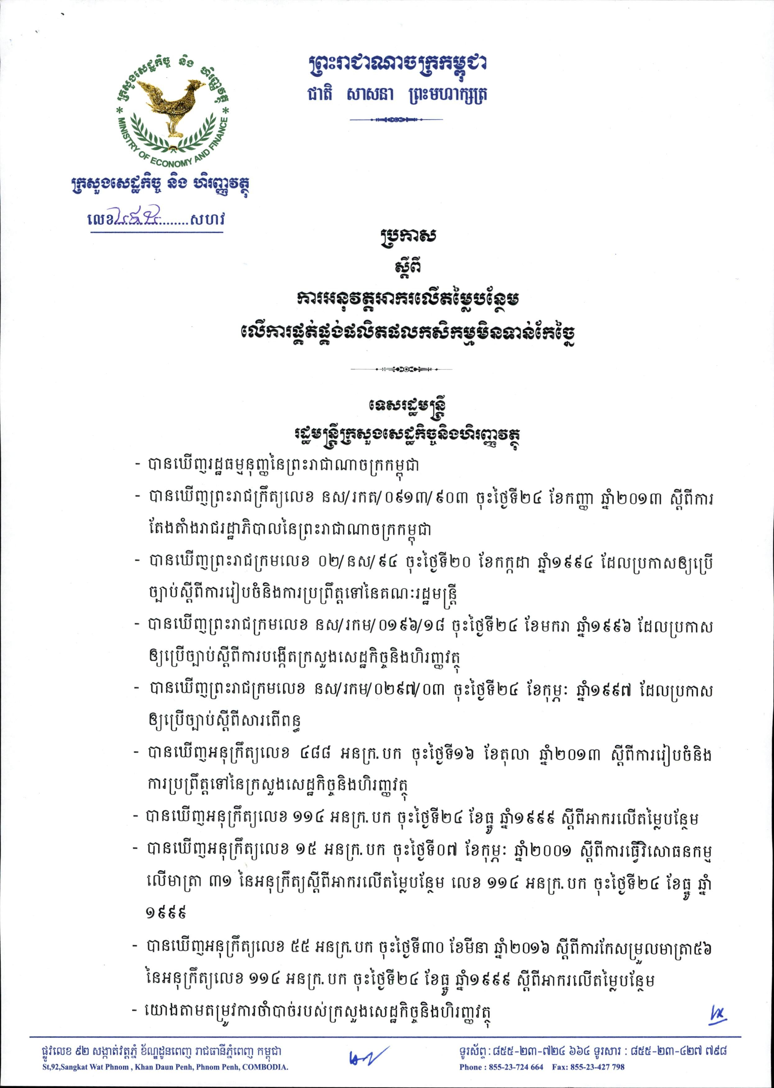 ប្រកាស ស្តីពី ការអនុវត្តអាករលើតម្លៃបន្ថែមចំពោះការផលិតនិងផ្គត់ផ្គង់ទឹកស្អាតជូនប្រជាពលរដ្ឋប្រើប្រាស់