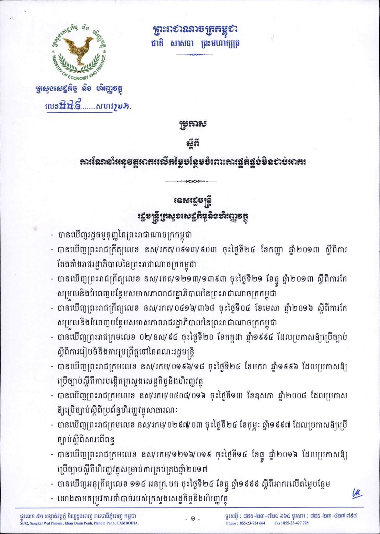 ប្រកាស ស្តីពី ការចាត់ជាបន្ទុករបស់រដ្ឋនូវអាករលើតម្លៃបន្ថែមលើមុខទំនិញដែលជាអាហារជាមូលដ្ឋានសម្រាប់ការរស់នៅប្រចាំថ្ងៃរបស់ប្រជាពលរដ្ឋ