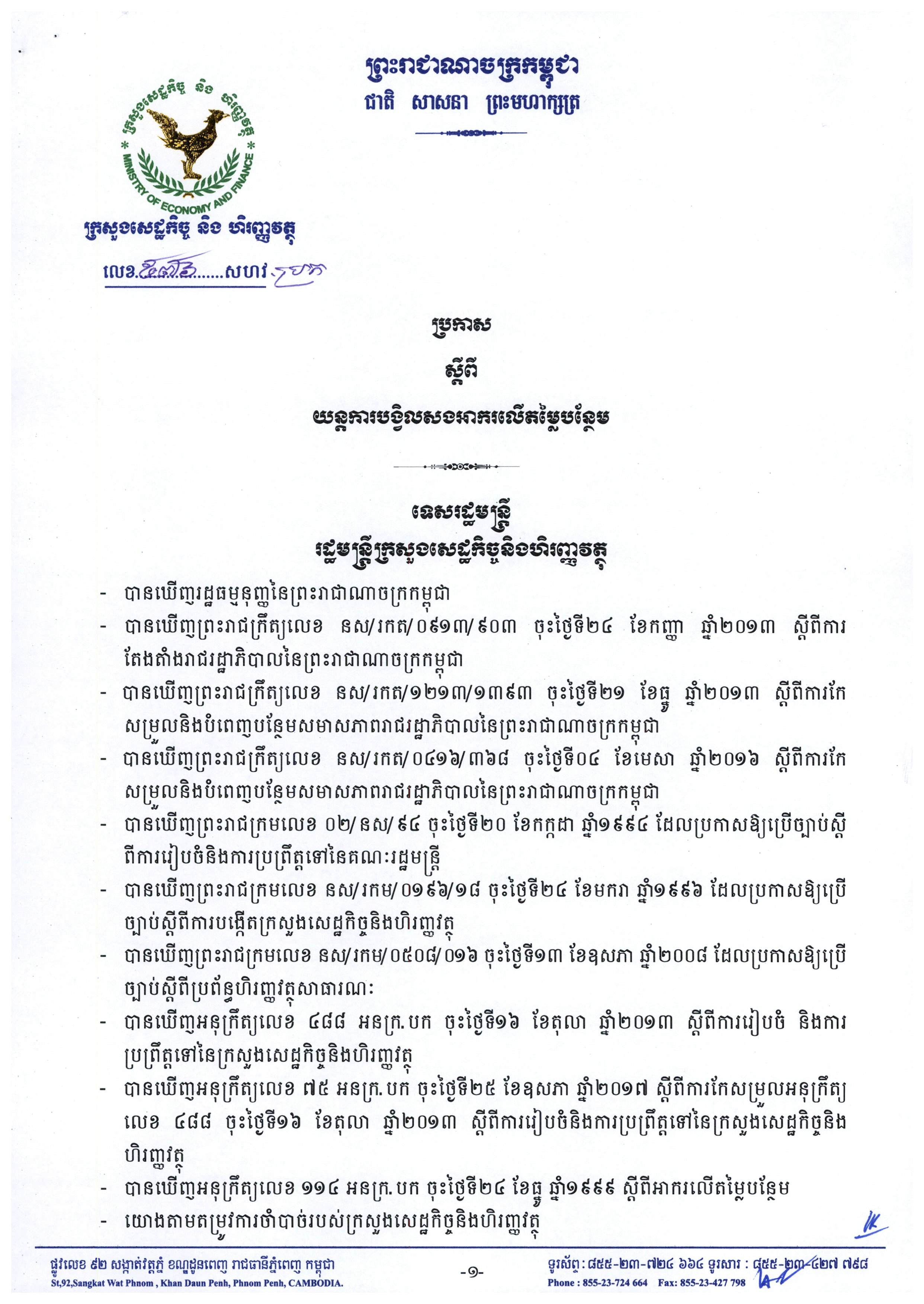 See Moreប្រកាសស្តីពីការណែនាំអនុវត្តអនុក្រឹត្យលេខ ១៥ អនក្រ.បក ចុះថ្ងៃទី០៧ ខែកុម្ភៈ ឆ្នាំ២០០១ ស្តីពីការធ្វើវិសោធនកម្មលើមាត្រា ៣១
