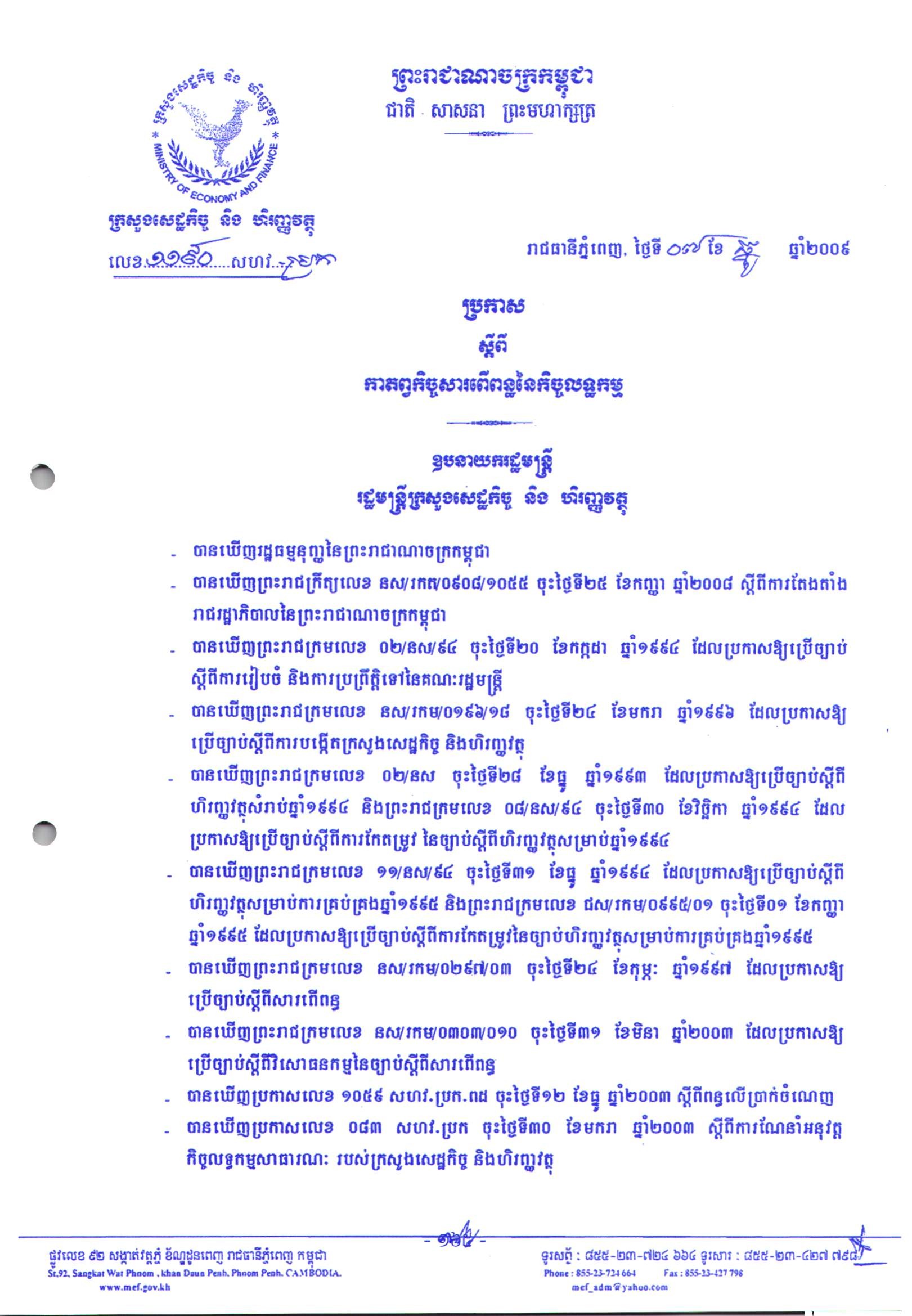 See Moreប្រកាស ស្តីពី ការអនុវត្តអាករលើតម្លៃបន្ថែមចំពោះឧស្សាហកម្មគាំទ្រ ឬអ្នកចុះកិច្ចសន្យាដែលធ្វើការផ្គត់ផ្គង់ទំនិញឬសេវាសម្រាប់បម្រើឱ្យការនាំចេញរបស់ឧស្សាហកម្មកាត់ដេរ ឧស្សាហកម្មកាត់ដេរ ឧស្សាហកម្មវាយនភ័ណ្ឌ ឧស្សាហកម្មផលិតស្បែកជើងឧស្សាហកម្មផលិតកាបូបយួរនិងកាបូបដៃ