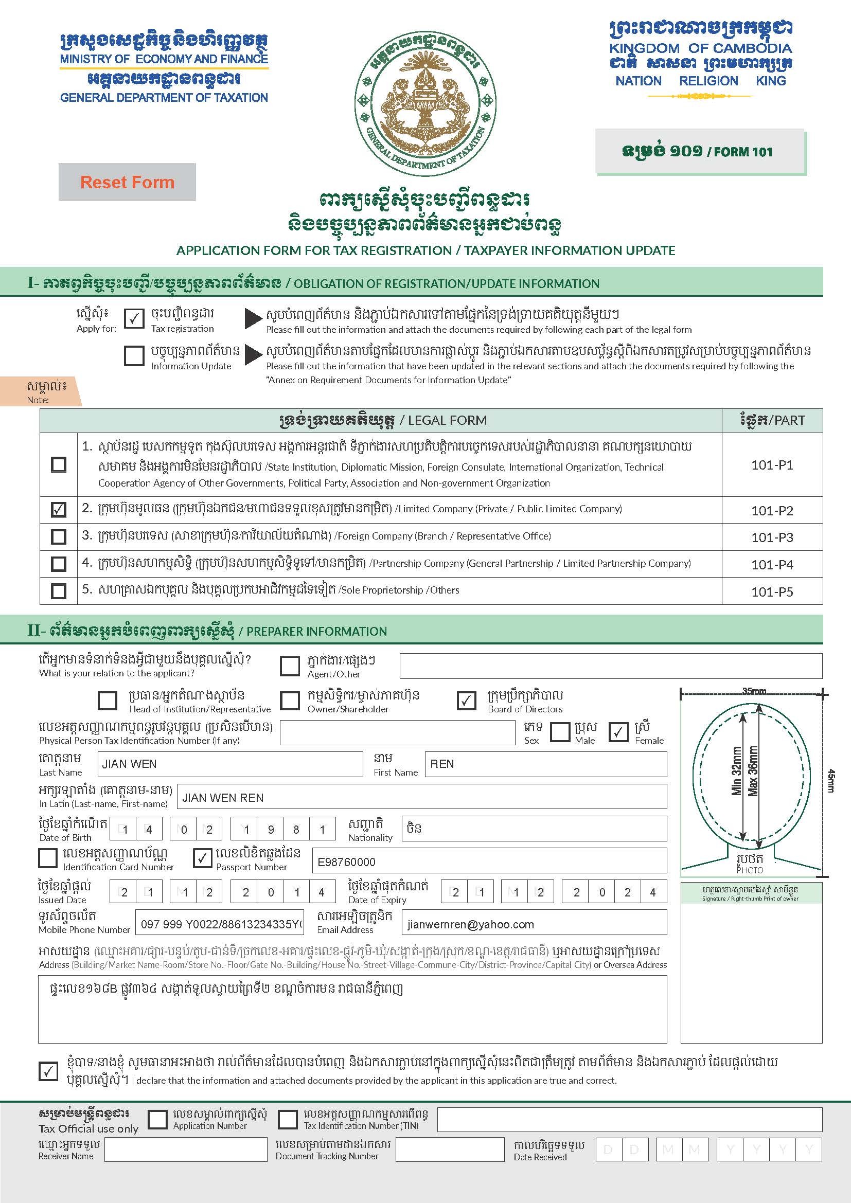 ពាក្យស្នើសុំចុះបញ្ជីពន្ធដារ និងបច្ចុប្បន្នភាពព័ត៌មានអ្នកជាប់ពន្ធ 6