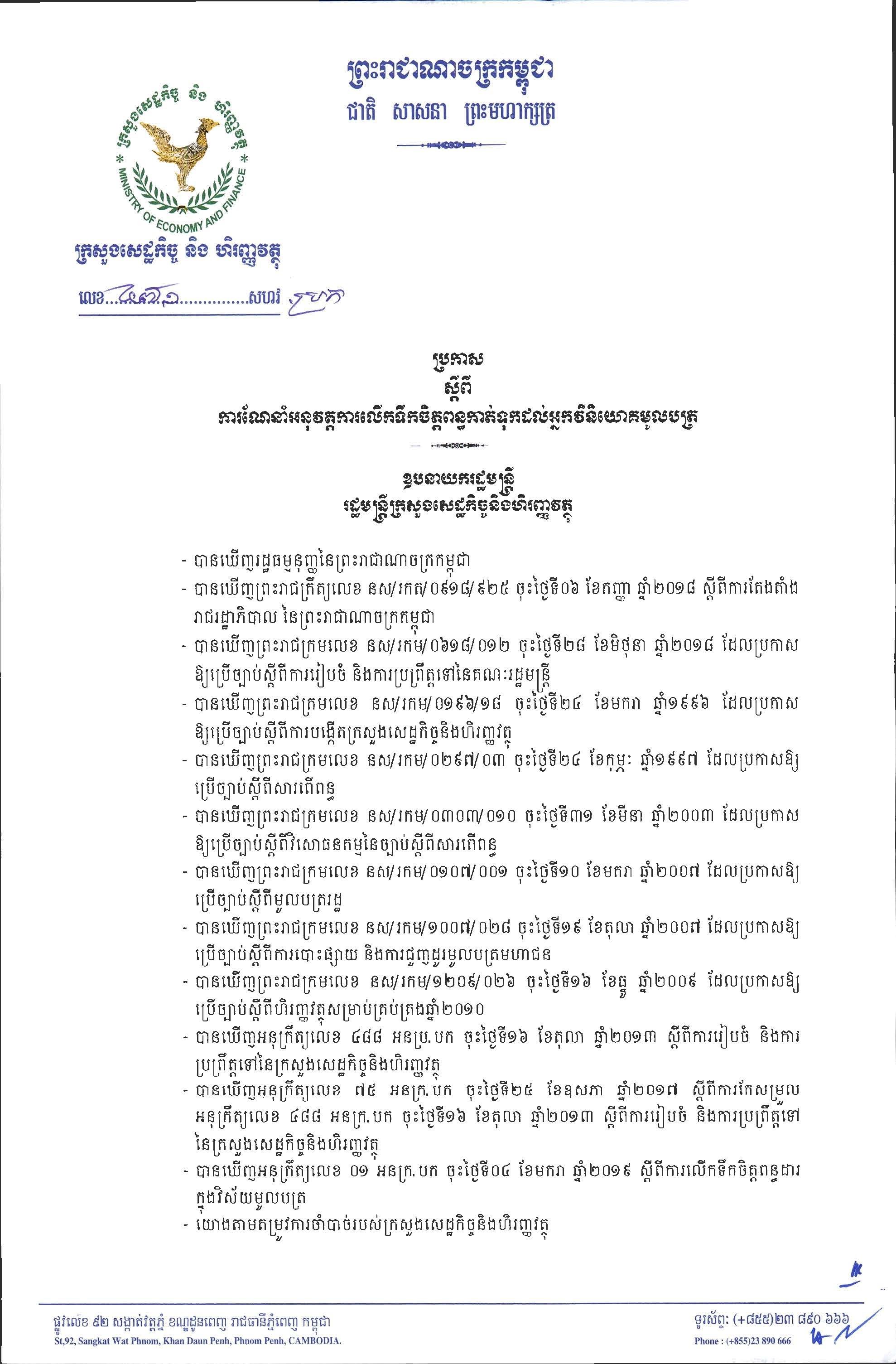 ប្រកាស ស្តីពី ការកែសម្រួលការណែនាំអនុវត្តពន្ធកាត់ទុកលើការបែងចែកភាគលាភ