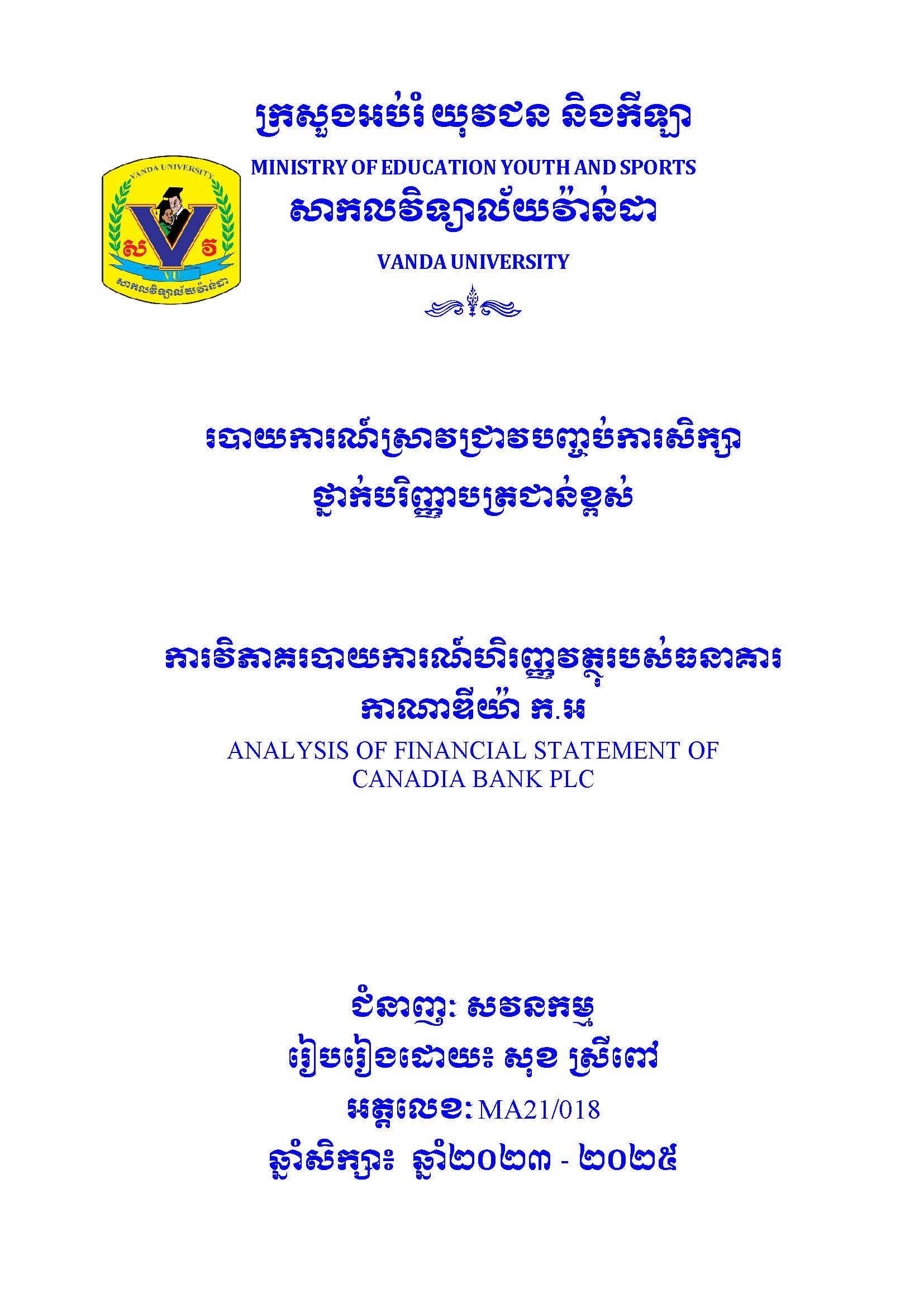 ការវិភាគរបាយការណ៍ហិរញ្ញវត្ថុរបស់ធនាគារវឌ្ឍនៈអាស៊ីចំកាត់ប្រចាំ៖ANALYSIS OF FINANCAIL STATEMNETS OF ADVANCED BANK OF ASIA LIMITED